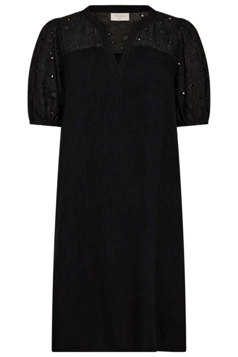 - Festlookét: Skal du til en fest eller et middagsselskab, kan du vælge en af Freequents elegante kjoler, som har et feminint og stilrent design. Kombiner kjolen med en flot cardigan eller en skindjakke for at tilføje et lag, der skaber dimension til dit outfit. For et mere sofistikeret look kan du tilføje statement-smykker som store øreringe eller et iøjnefaldende armbånd. Hæle og en lille clutch fuldender looket, og du er klar til enhver festlig lejlighed.