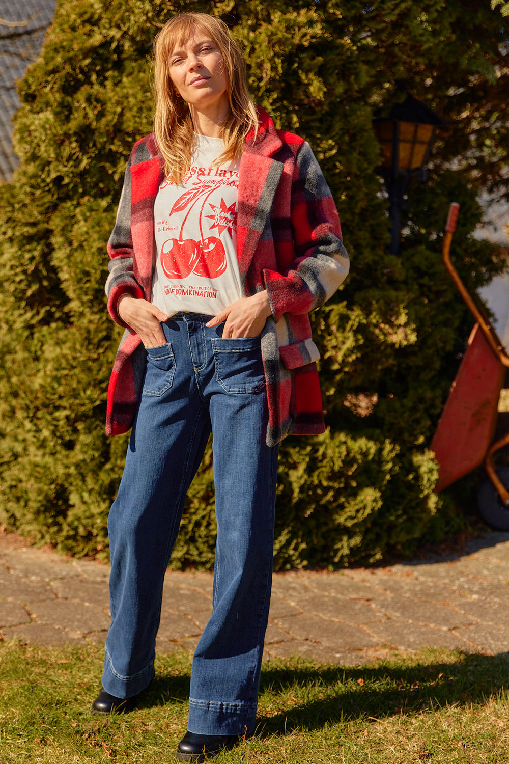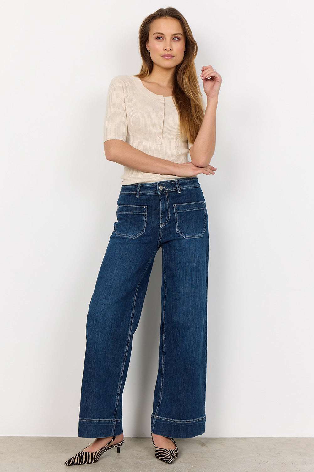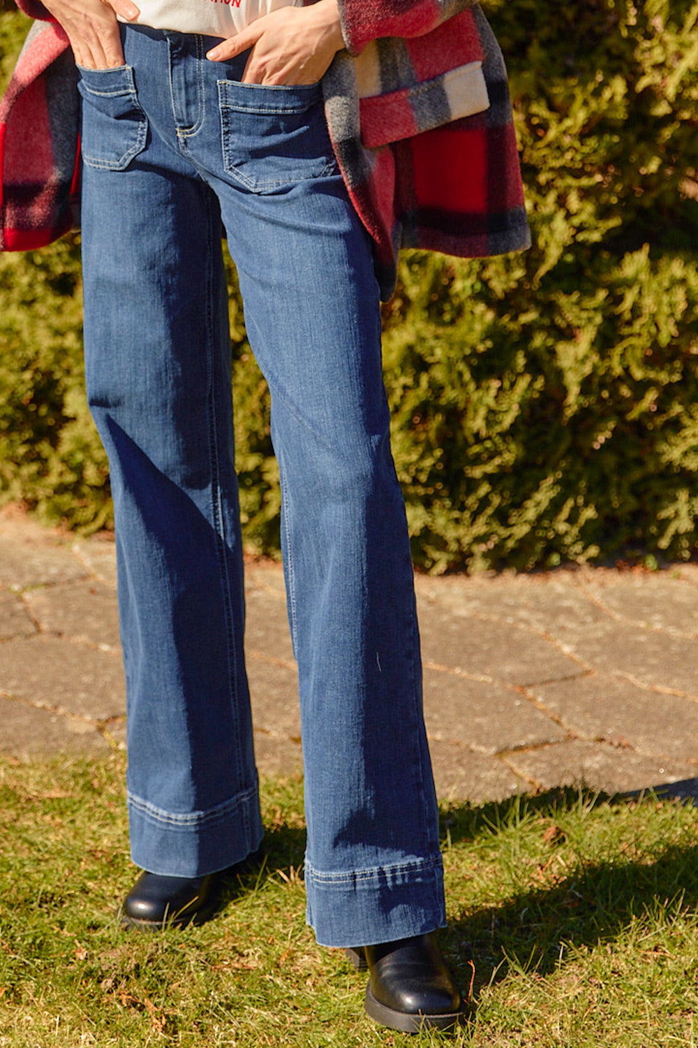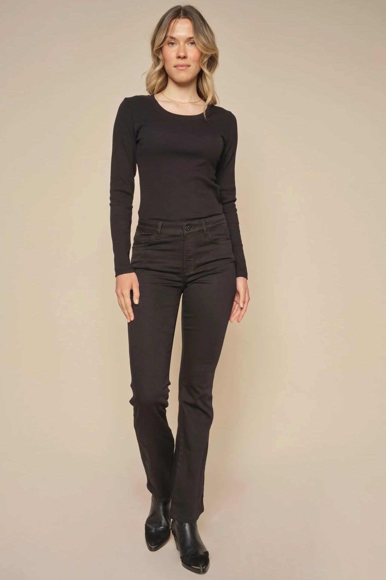- Støvler eller høje hæle: Her kan du vælge en længere længde, især ved bootcut eller flared jeans, for at give et elegant udtryk, hvor jeansene netop når ned til skoens kant.