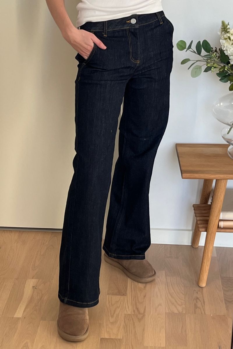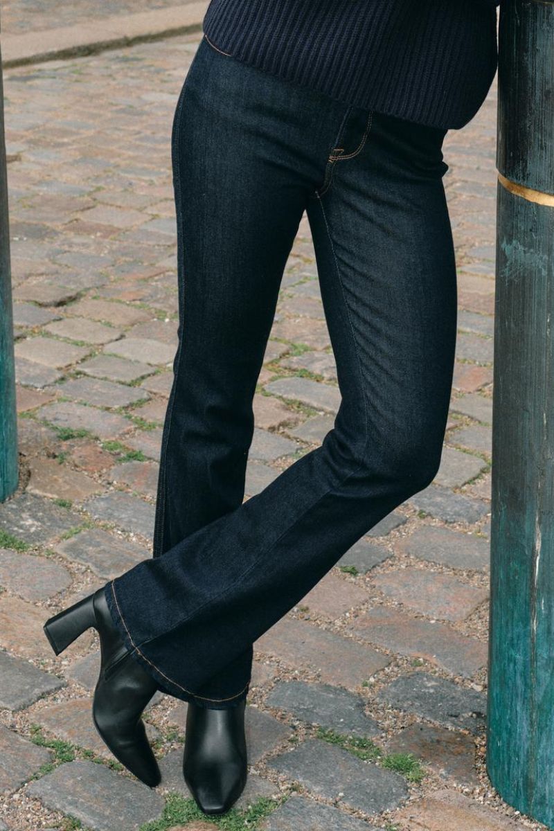 - Bootcut eller flared jeans: Denne type jeans har en bredere bund, som ofte kræver en længere længde, så de falder pænt over skoen.