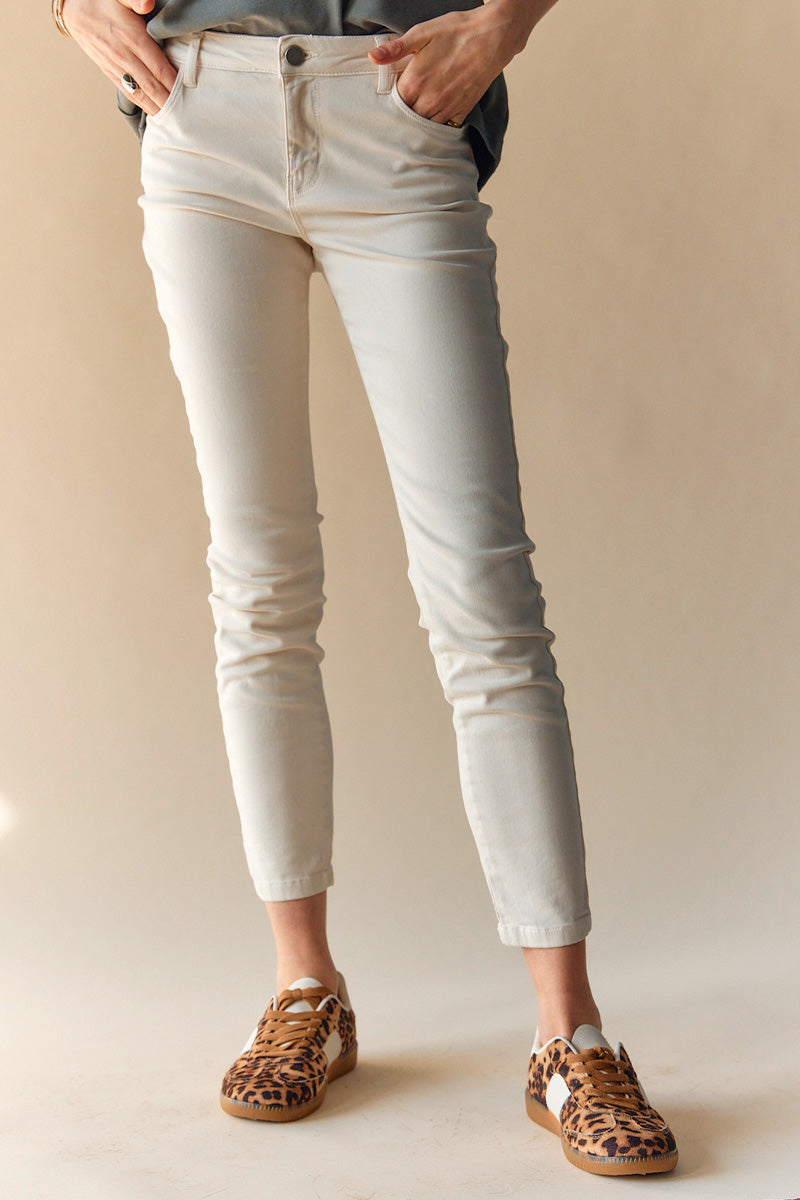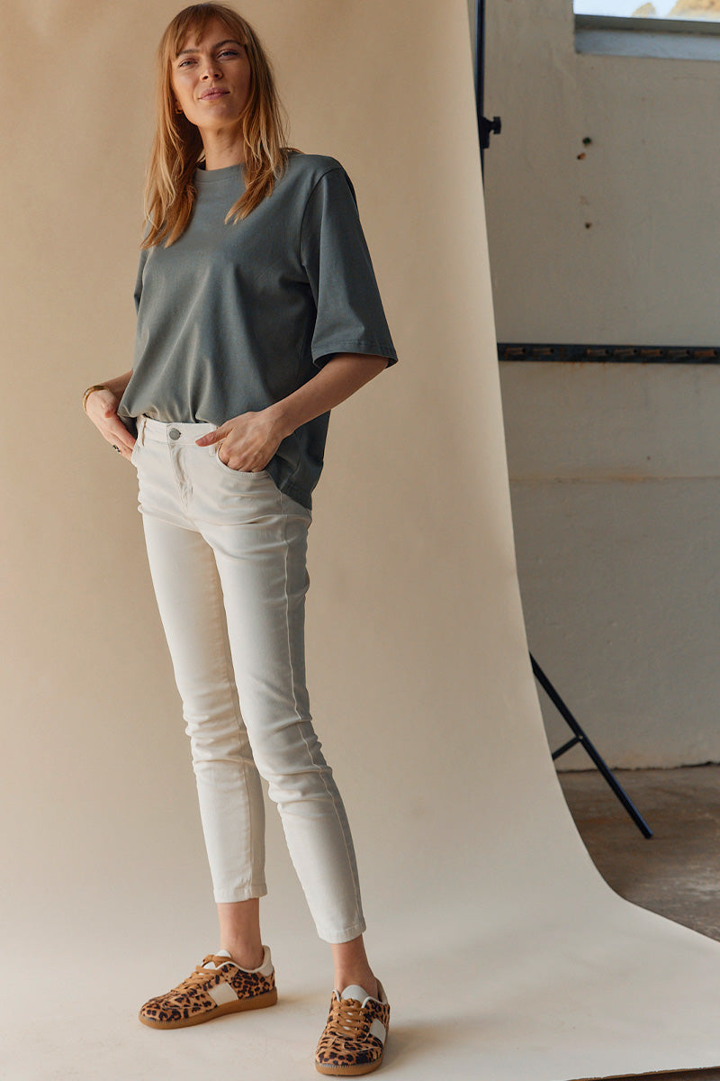 - Skinny jeans: Disse sidder tæt til benet og må gerne være en anelse kortere, så de sidder perfekt ved anklen.