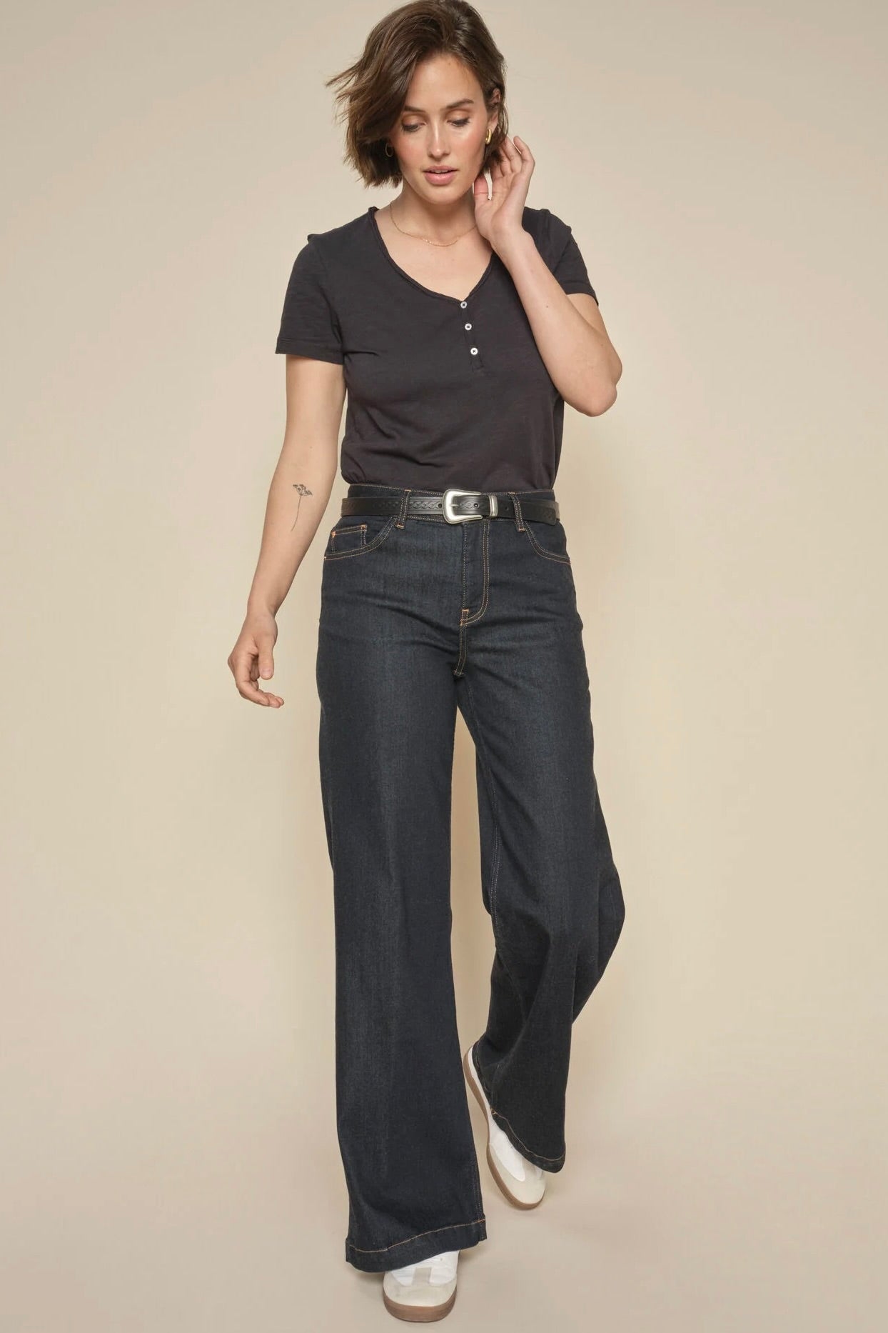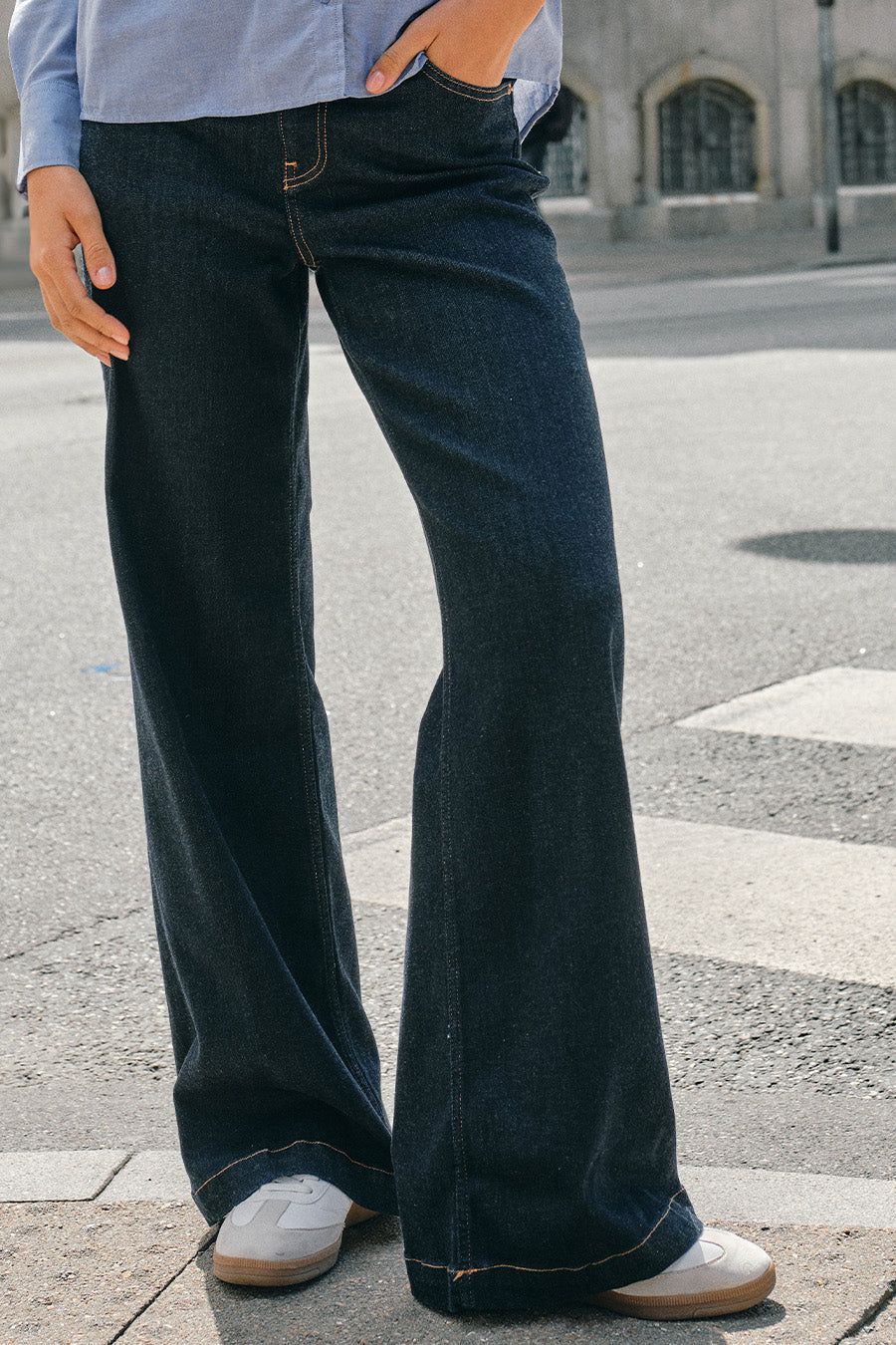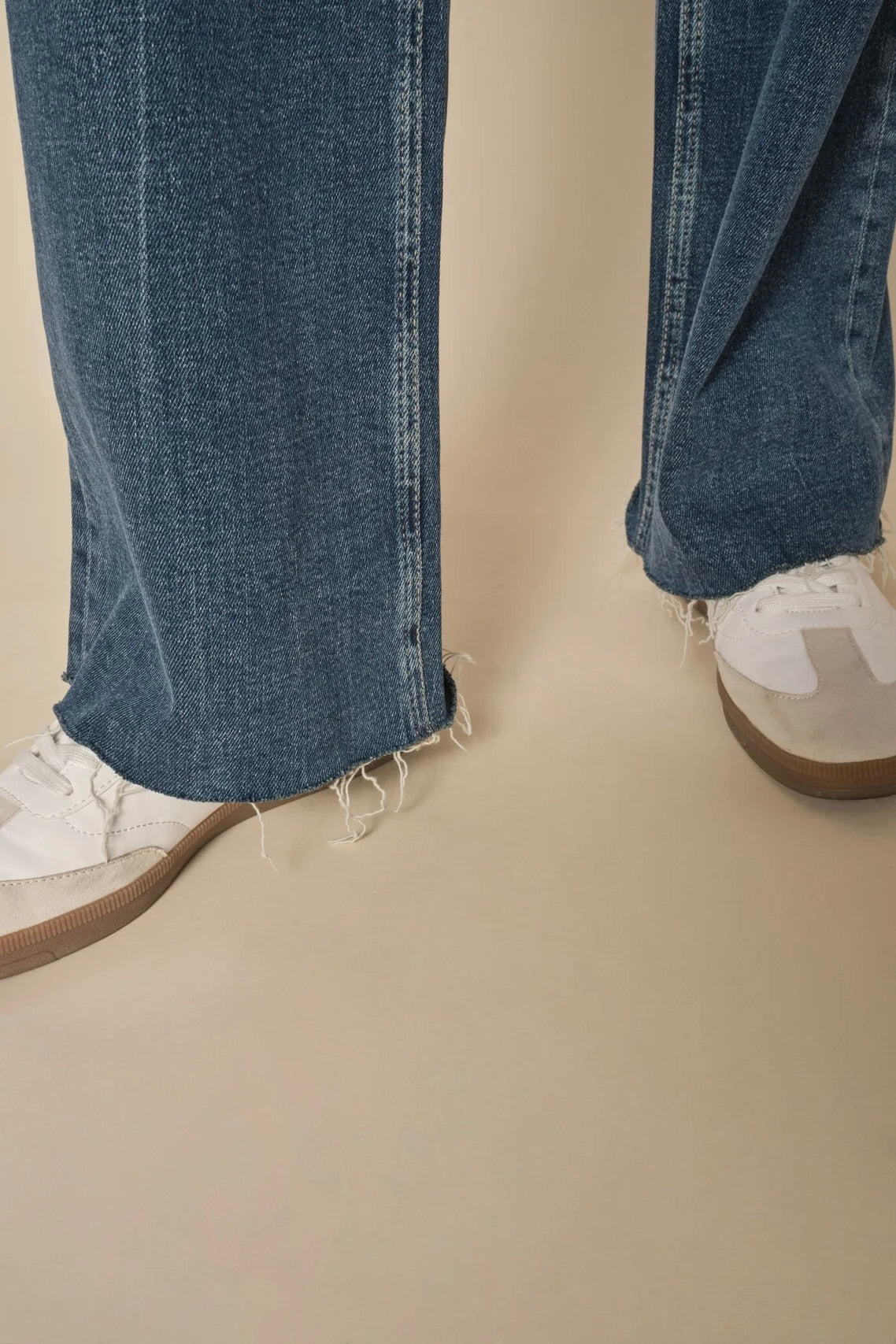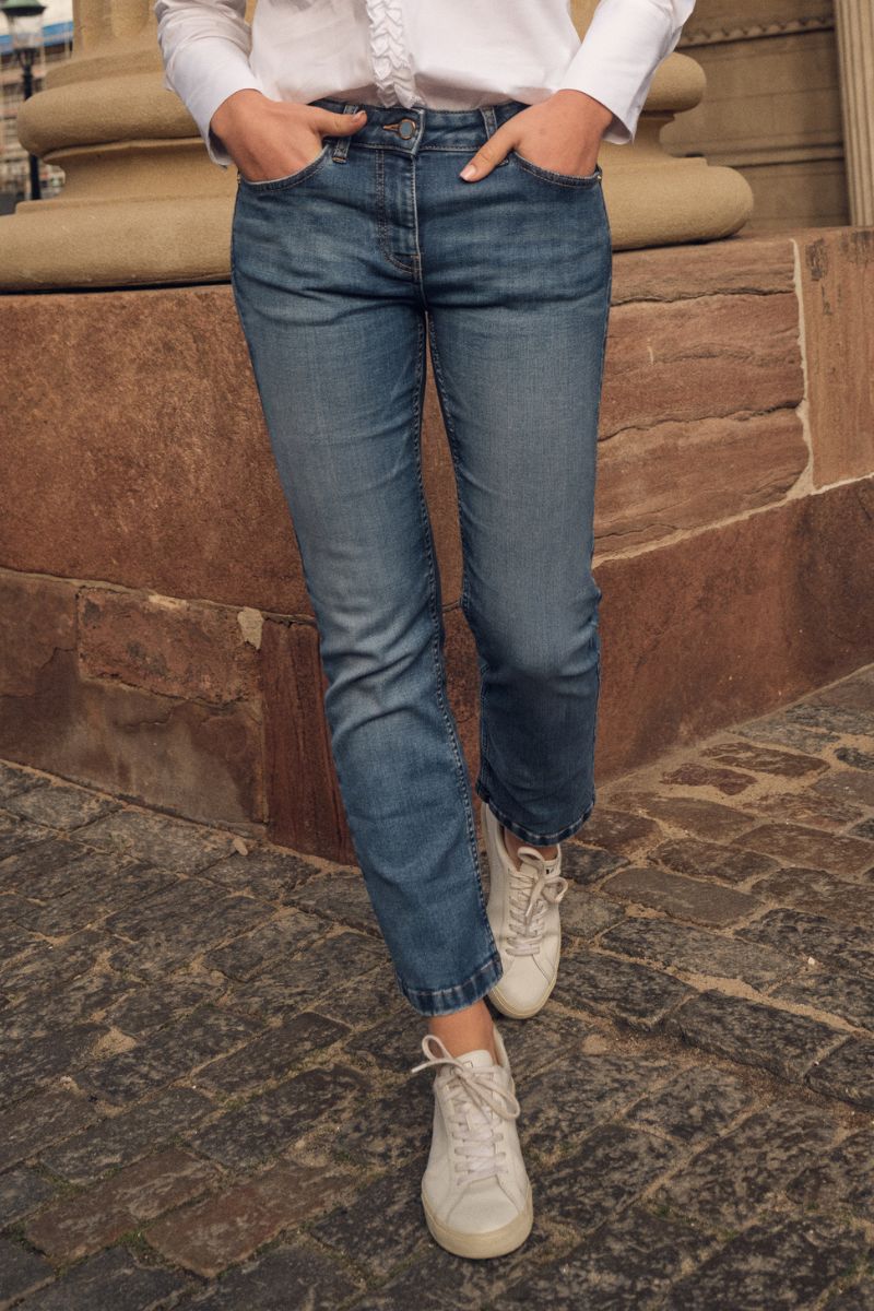 - Flade sko eller sneakers: Hvis du foretrækker fladt fodtøj som sneakers, bør dine jeans ikke være for lange, da de kan skabe en "bølge-effekt" ved anklen.