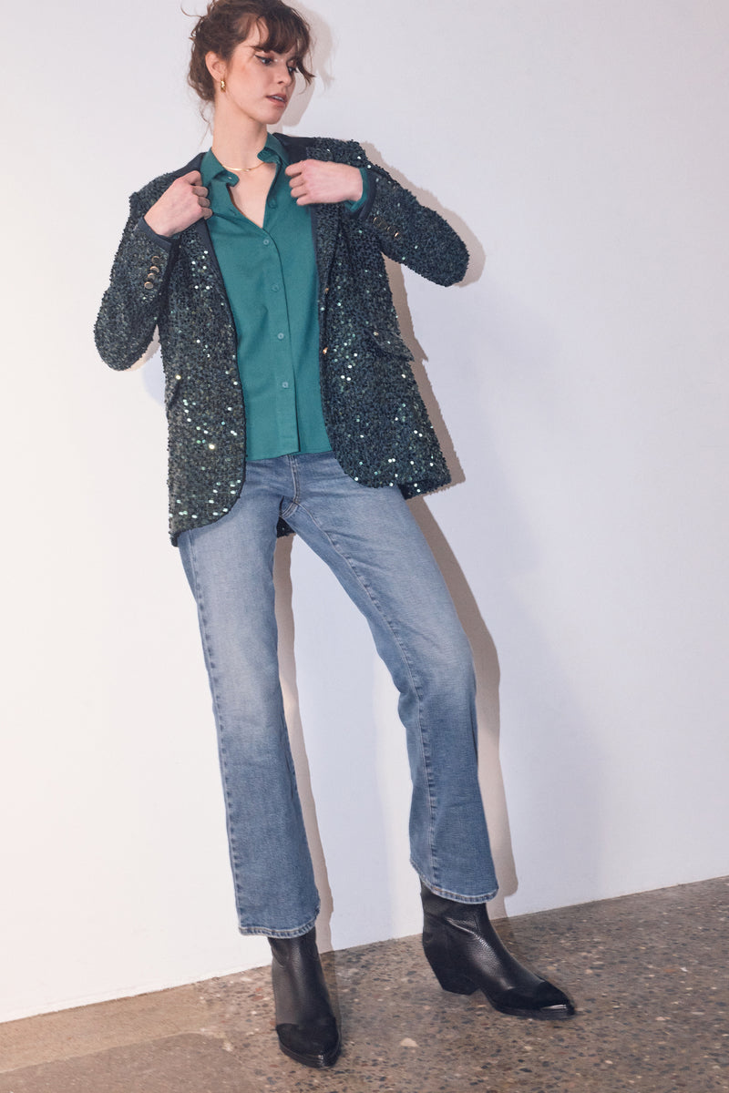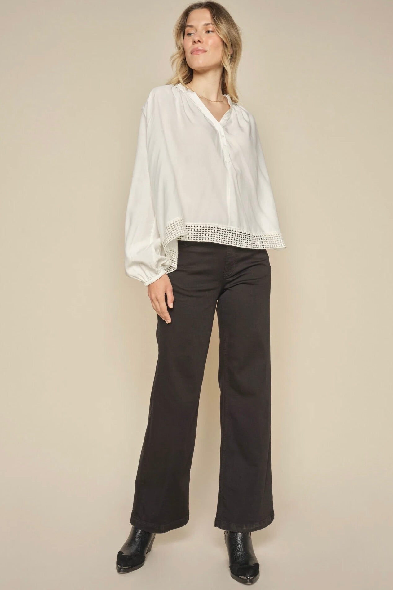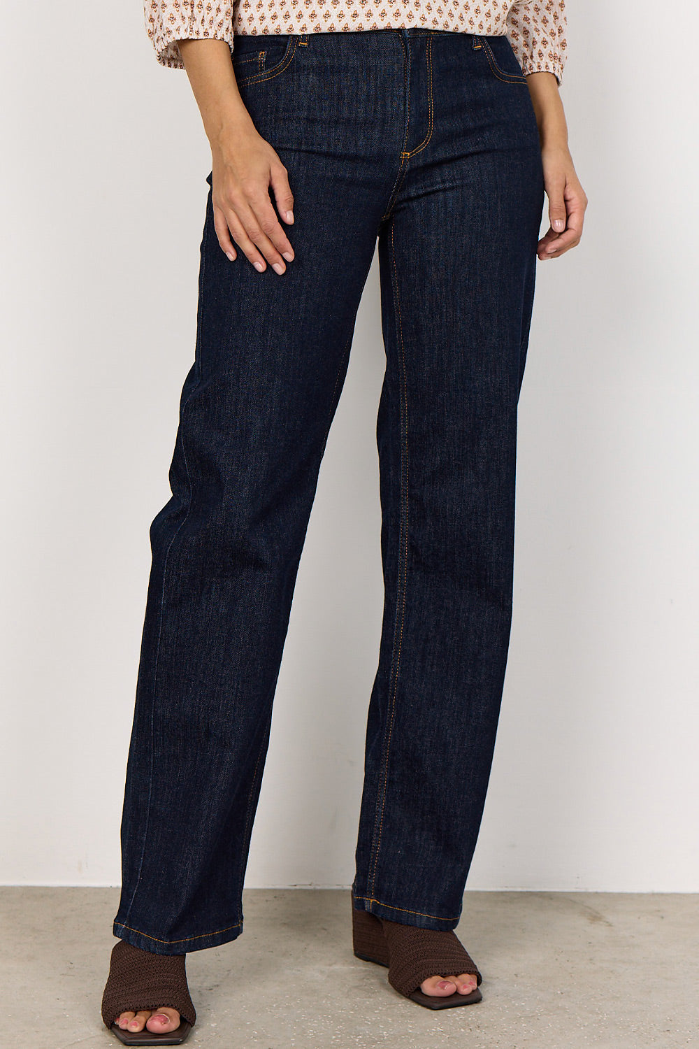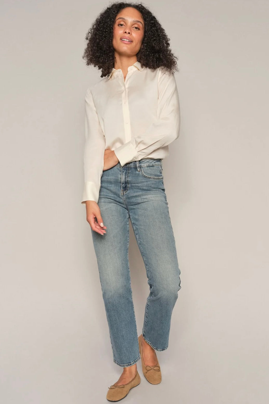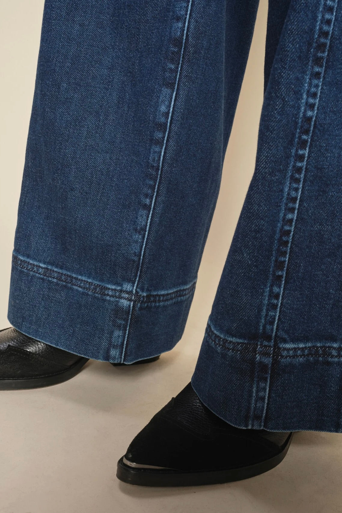 - Støvler eller høje hæle: Her kan du vælge en længere længde, især ved bootcut eller flared jeans, for at give et elegant udtryk, hvor jeansene netop når ned til skoens kant.
