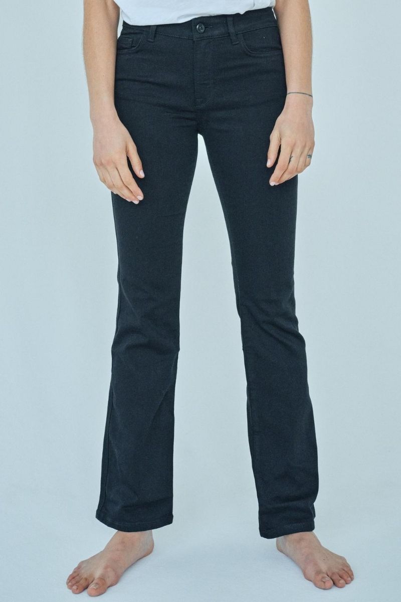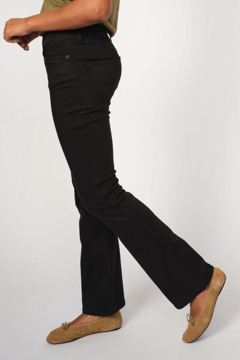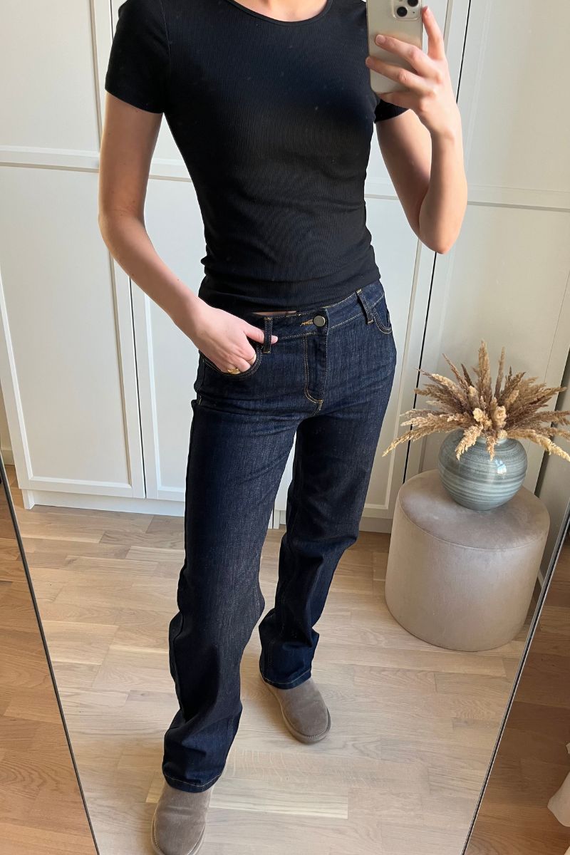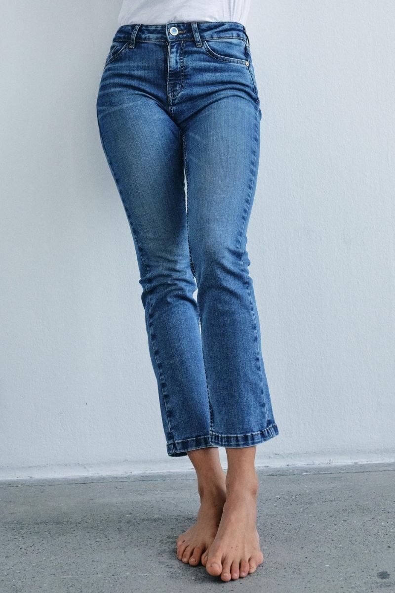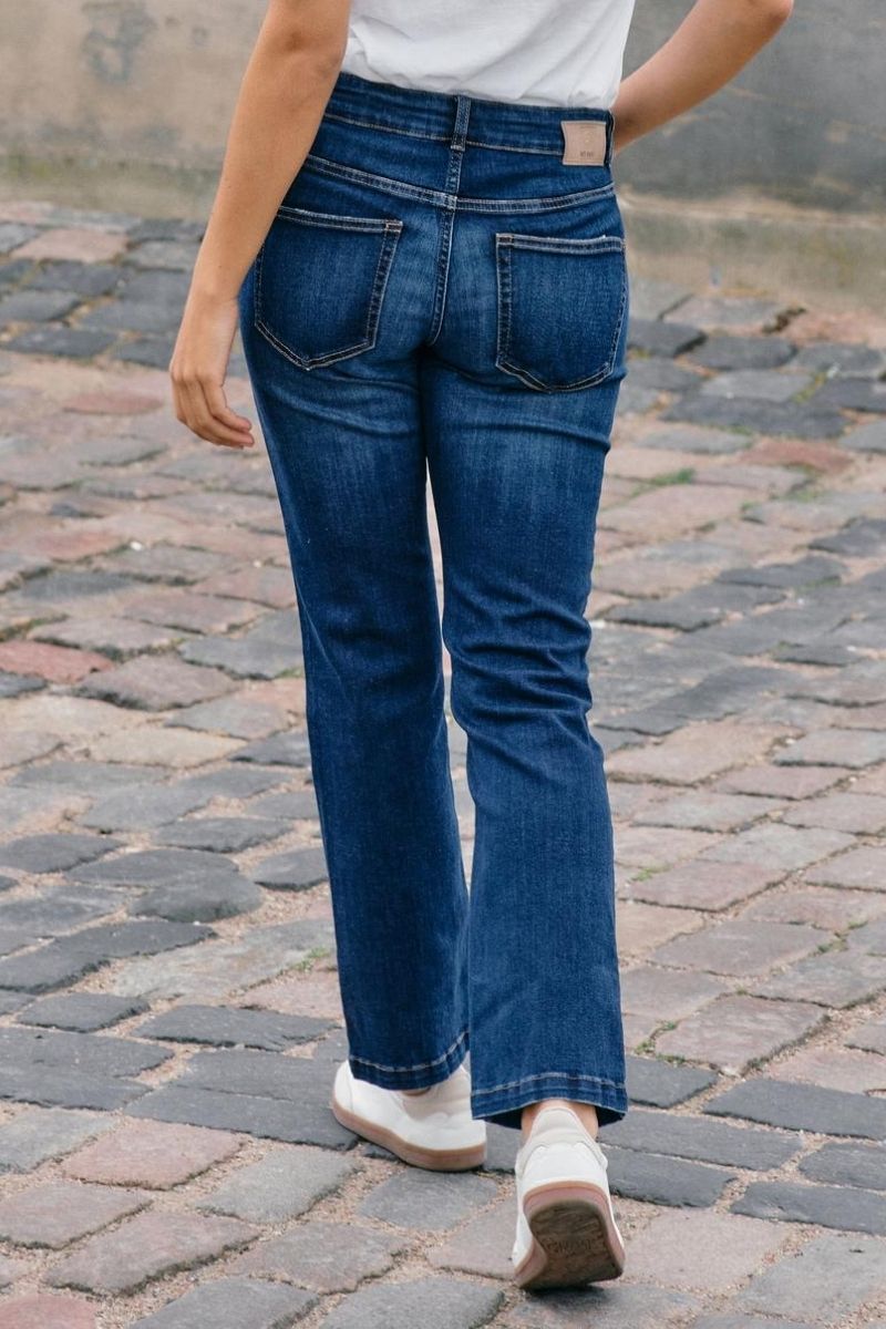- Bootcut eller flared jeans: Denne type jeans har en bredere bund, som ofte kræver en længere længde, så de falder pænt over skoen.