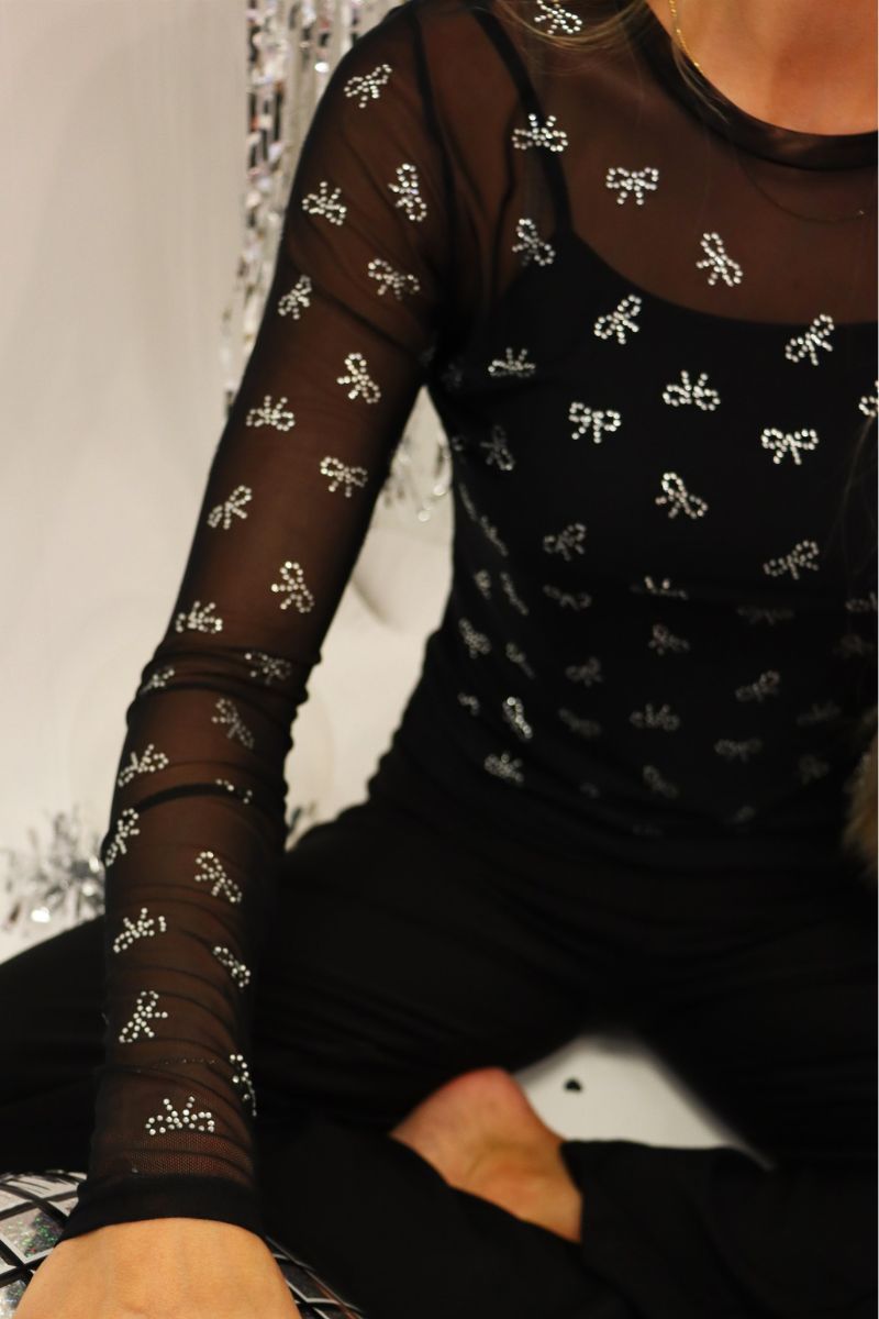 Mesh Ls Sparkle Tshirt | Black Bow Diamond Dot