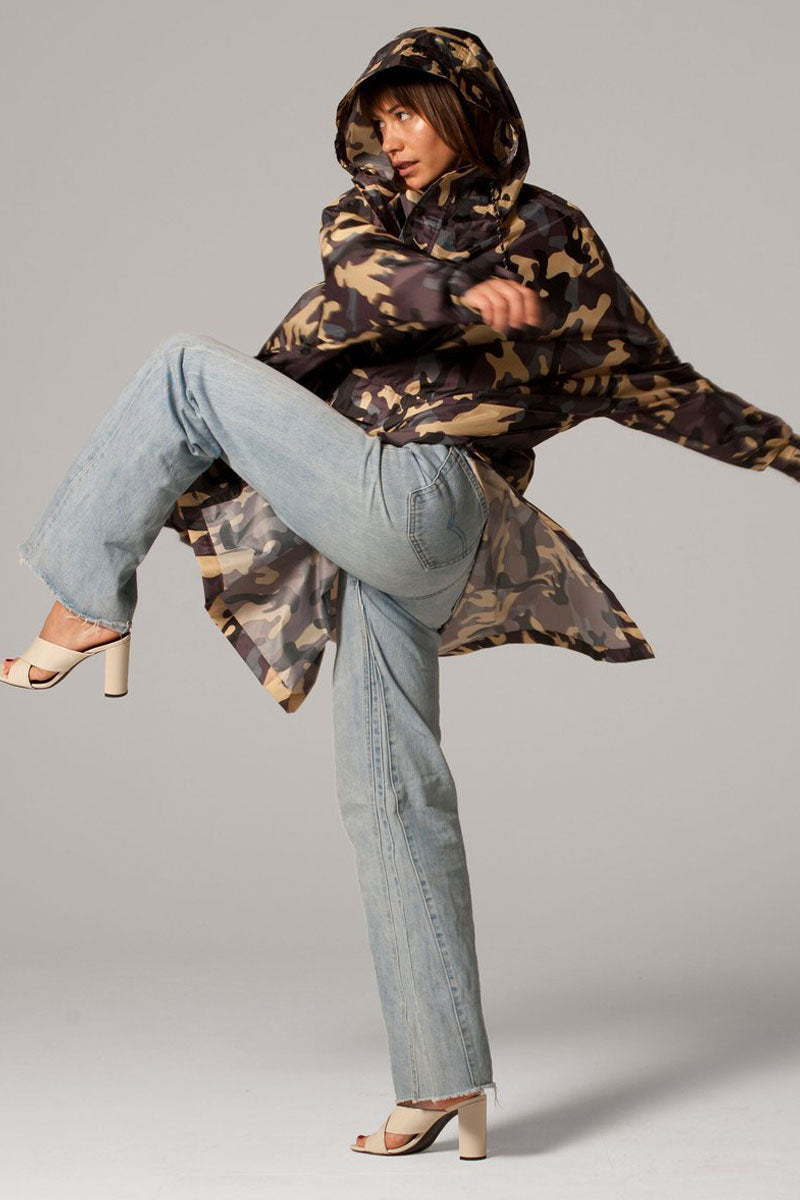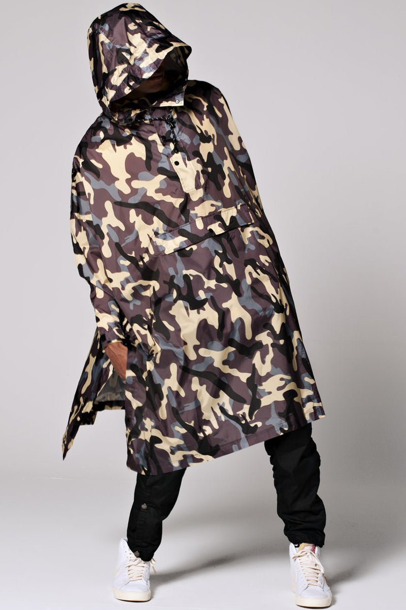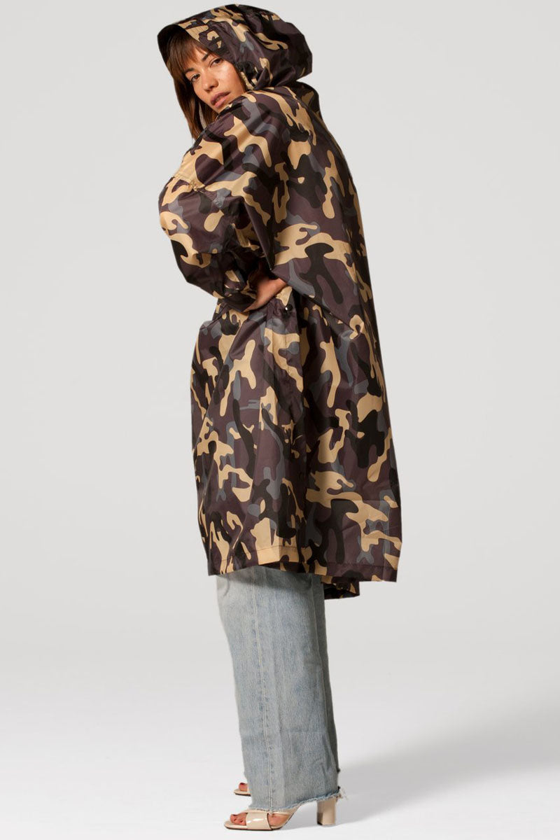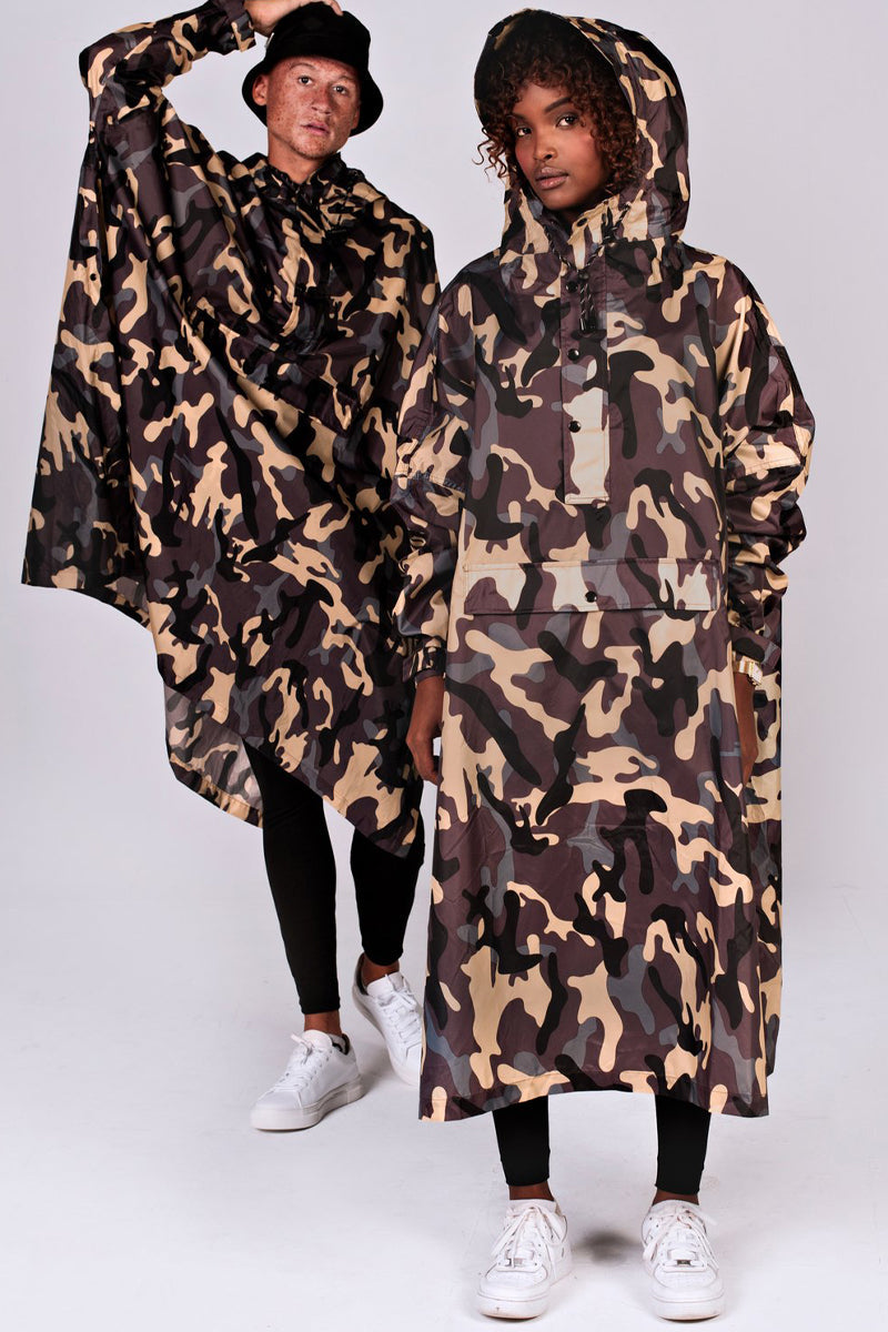 Med sit militærinspirerede camouflageprint er denne regnponcho perfekt til dem, der ønsker et urbant og edgy look, samtidig med at de holder sig tørre. Den armybrune farve giver et cool udtryk, der kan bruges til både hverdagsbrug og udendørs eventyr. -